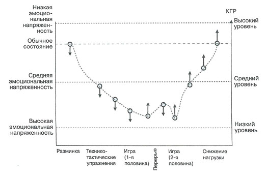 Изменения КГР как показателя эмоциональной напряжённости баскетболистов во время тяжёлой тренировки (по Blumenstein, 2004, личное сообщение автору)