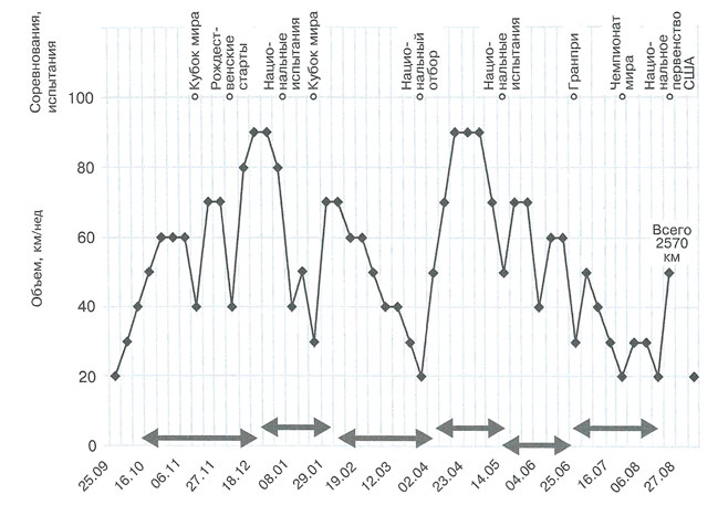 График годичной подготовки Майкла Фелпса в сезоне 2000-2001 гг. График составлен на основе оригинальных данных тренера Боба Боумена