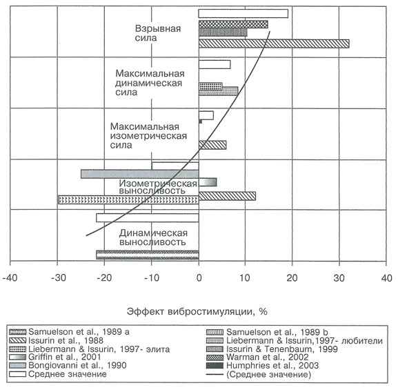 Краткое представление результатов исследований острых эргогенных эффектов после выполнения упражнений с локальным вибрационным воздействием, направленных на проявление различных силовых способностей (по Issurin, 2005)