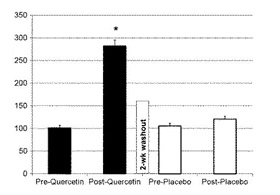 Изменение концентрации кверцетина в плазме крови (мкг/л, ось ординат) после приема кверцетина в дозе 1000 мг/день в течение 2-х недель (темные столбики: pre – до приема БАДа, post – после приема) и плацебо (светлые столбики: pre – до плацебо, post – после).