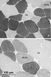 | 12:24, 1 октября 2014 | Muscle fiber eldery.gif (файл) | 132 КБ | Срез мышечных волокон I (темные) и IIa (светлые) и IIb/IIx типа (А) у пожилых и (B) молодых людей. С возрастом количество волокон II типа сокращается. | 1 | |